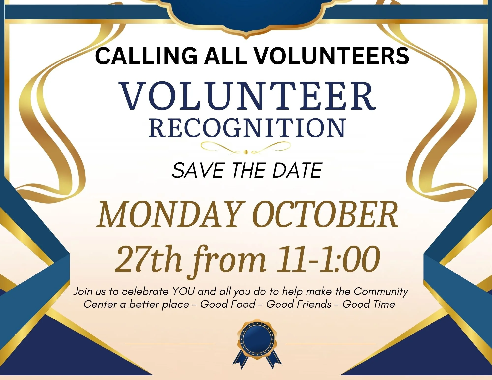 Oct 27: Monday, 11 am - 1 pm Volunteer’s at the Community Center Recognition Event